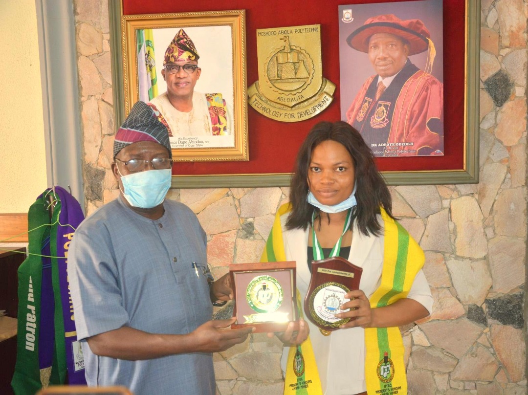 Adetutu on Tuesday presented the honourary award to the Ag. Rector to show appreciation to the management of Moshood Abiola polytechnic and the lecturer who taught and made her.