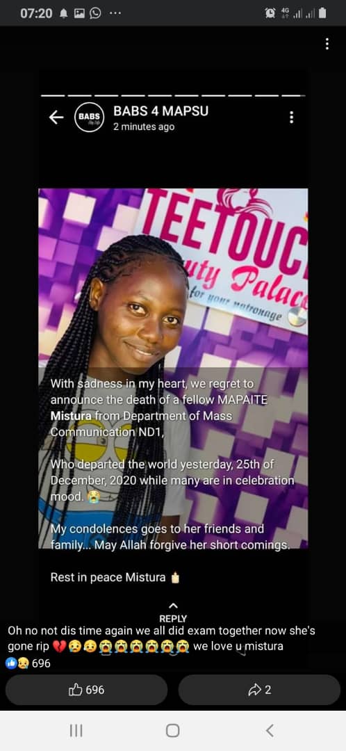 Press Club MAPOLY gathered that the deceased, Mistura Razaq died in the early hours of Saturday after celebrating the christmas with her family on Friday.