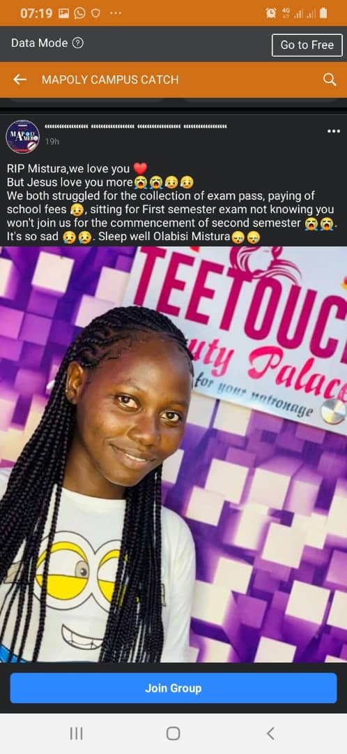 “Association of Mass Communication Students, MAPOLY, commiserates with the entire students of the department over the demise of Rasaq Olabisi Mistura, an ND1 student with matric number 19/24/2001(stream B).