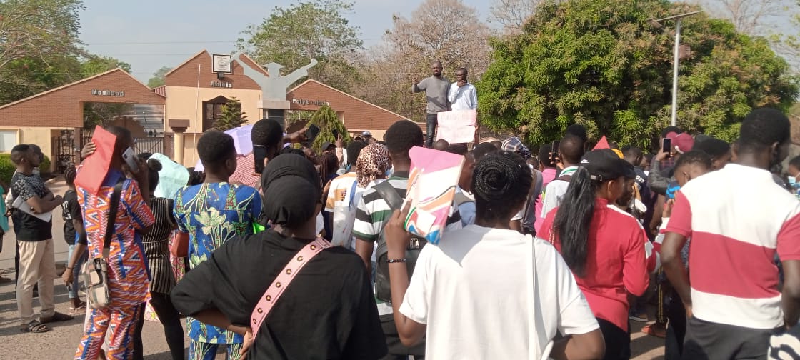 Concerned students of Moshood Abiola Polytechnic are currently protesting at the school gate over the recent increment in clearance fees, loss of receipt and other miscellaneous fees.