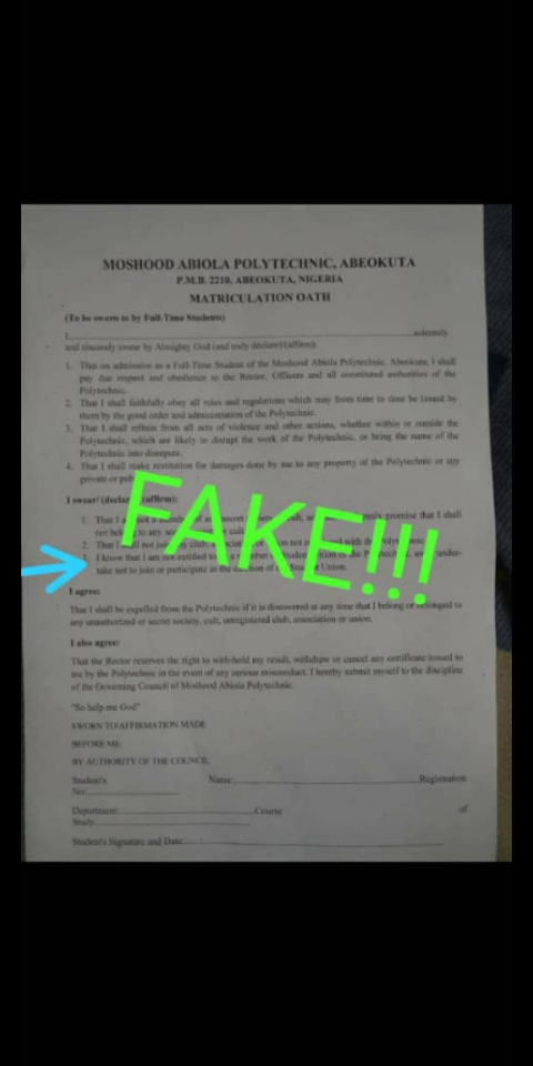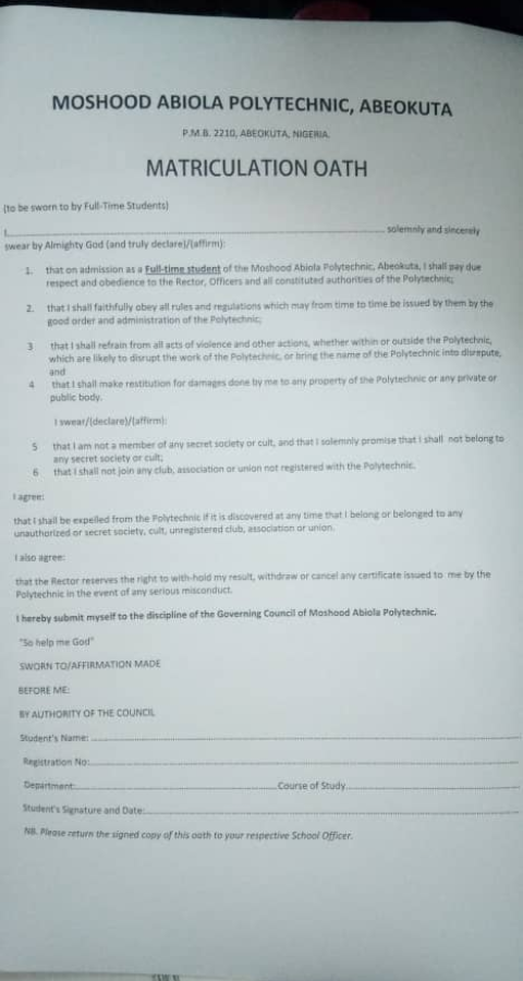 “I swear and declare/ affirm: “I know that I am not entitled to be a member of the Students Union of the Polytechnic and I undertake not to join or participate in the election of the Students Union.”