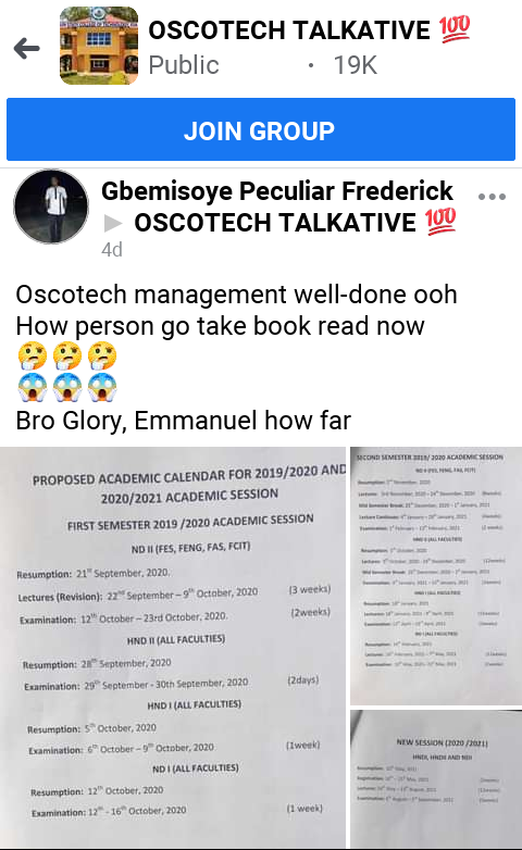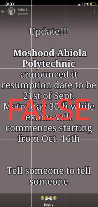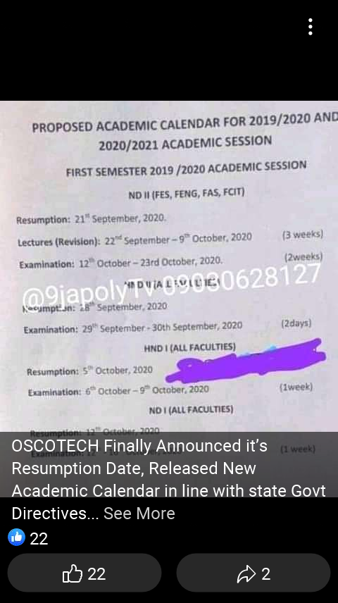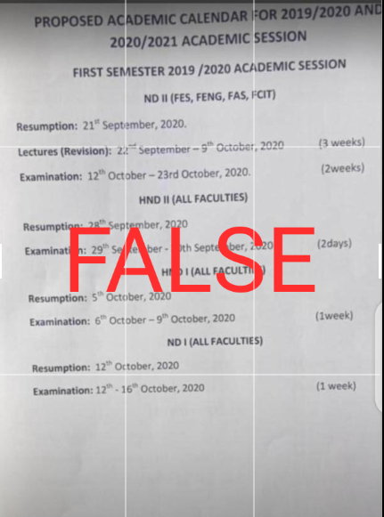 On September 10, a calendar was circulated via Whatsapp claiming to be the new proposed academic calendar for Moshood Abiola Polytechnic suspended first semester 2019/2020 academic session.