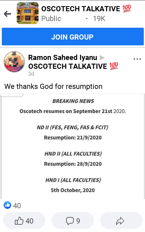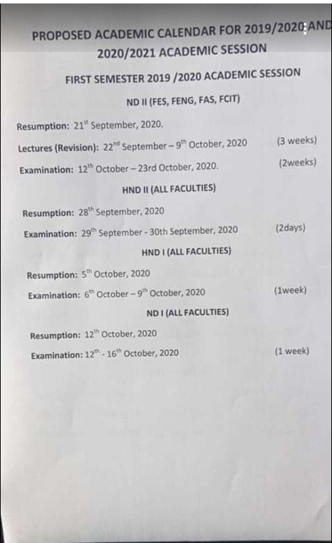 It stated that ND2 students of the Faculty of Environmental Studies (FES), Faculty of Enigineering Technology(FENG), Faculty of Applied Science (FAS) and Faculty of Information Technology (FCIT) will commence lectures and revision for three weeks between September 22nd to October 9th.