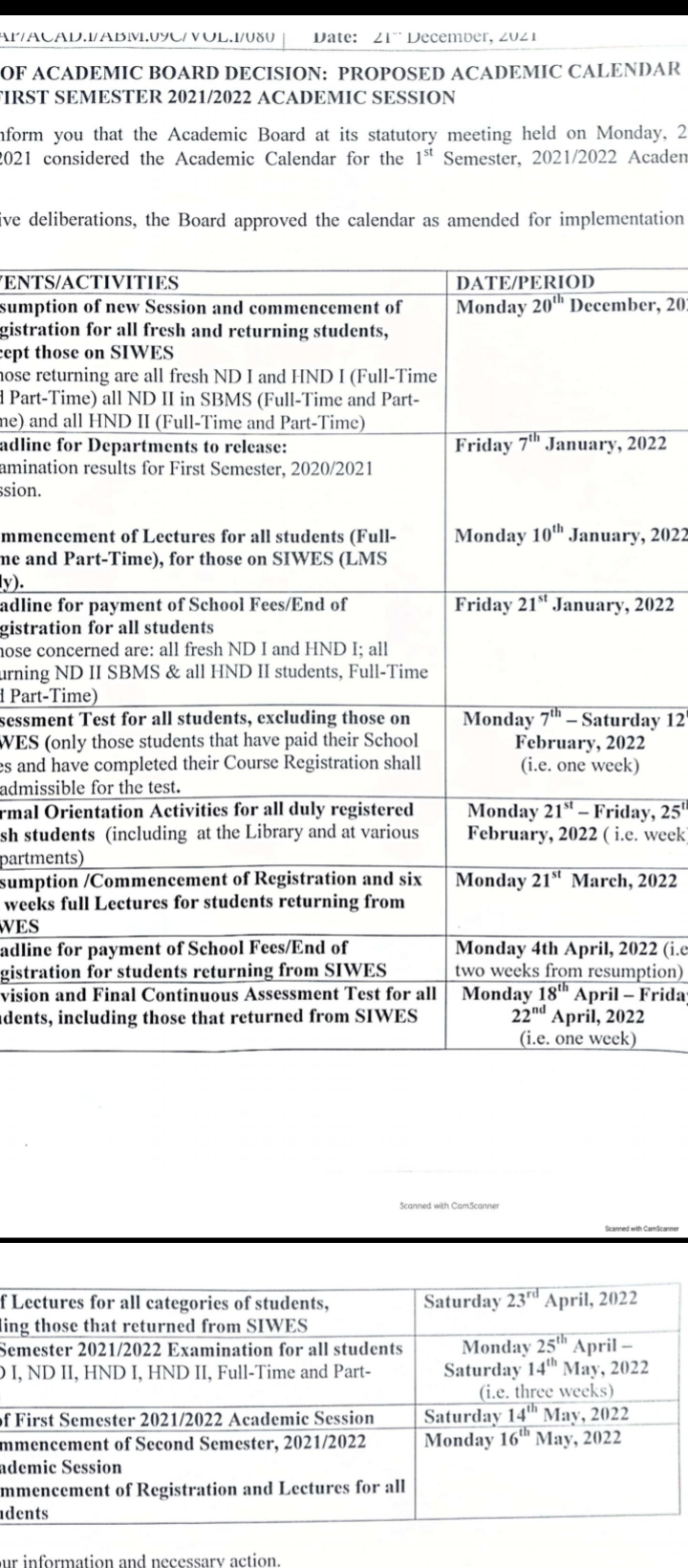 The new academic calender states that lectures will start by January 19th, 2022 and deadline for the payment of school fee is January 21st, 2022.