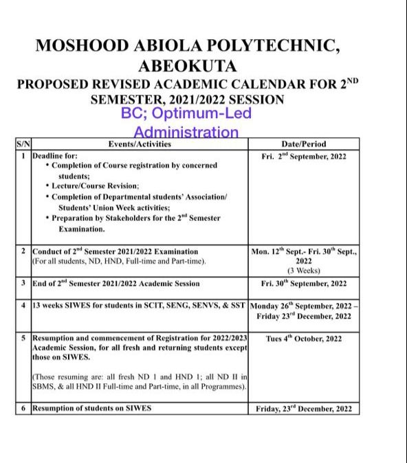 The Management of Moshood Abiola Polytechnic has stated that the second-semester examination for the 2021/2022 academic session which was earlier postponed will commence on the 12th, of September 2022.