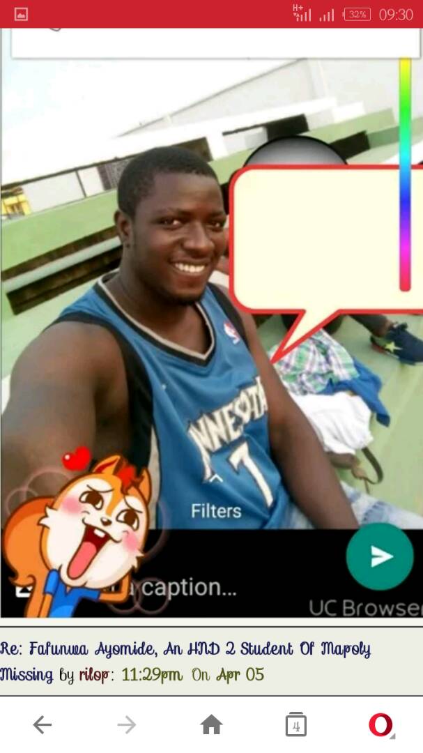 Reports reaching Press Club MAPOLY has it that an HND 2 student of Electrical/electronics engineering department is missing.