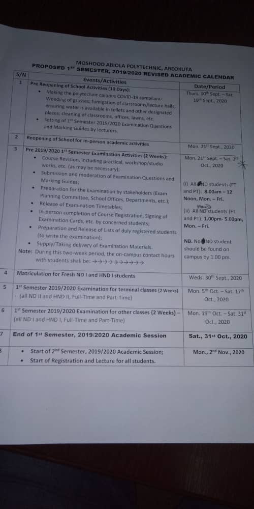 A proposed academic calendar by the management for first semester 2019/ 2020 academic session obtained by Press Club MAPOLY stated that the polytechnic will resume for in- person activities starting from September 21st.