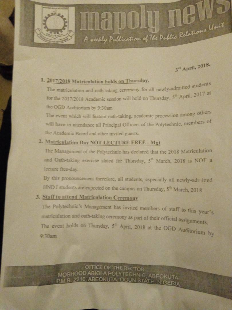 “The management of the polytechnic has declared that the 2018 matriculation and oath-taking exercise is not a lecture free day.