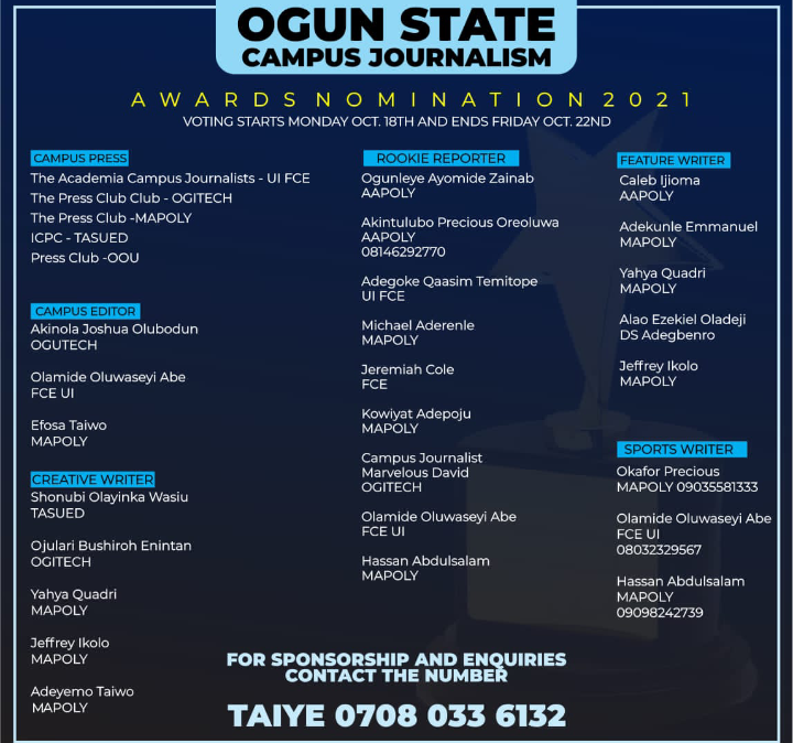 Press Club Mapoly has unveiled the list of nominees who will be competing for the campus journalism award at the forthcoming Ogun State Campus Journalism Summit.