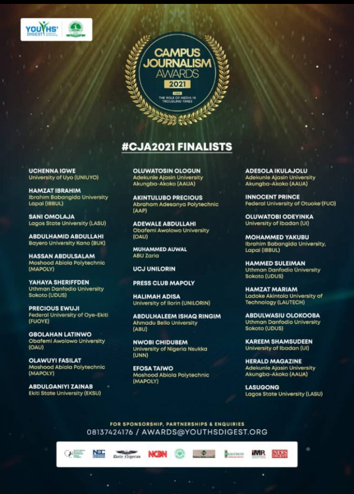 “The awardees for the Campus Journalism Awards will be announced at Hotel 2020, Wuye District, Abuja on Saturday 11th December, 2021 by 3pm prompt,” he added.