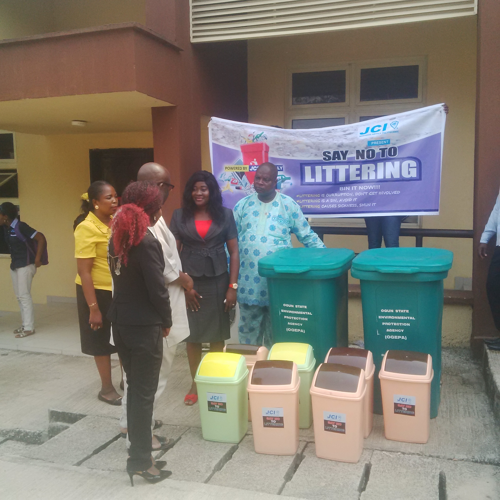 • President, JCI MAPOLY, Mujeedat Omowunmi (2nd left); Director of Students’ Affairs, Seyi Shobande (3rd left); General Manager, Ogun State Environmental Protection Agency (OGEPA), Tpl. Olufunmilayo Kuti and JCI MAPOLY Staff Adviser, Mr Osifalujo during the donation of waste bins to MAPOLY by OGEPA…